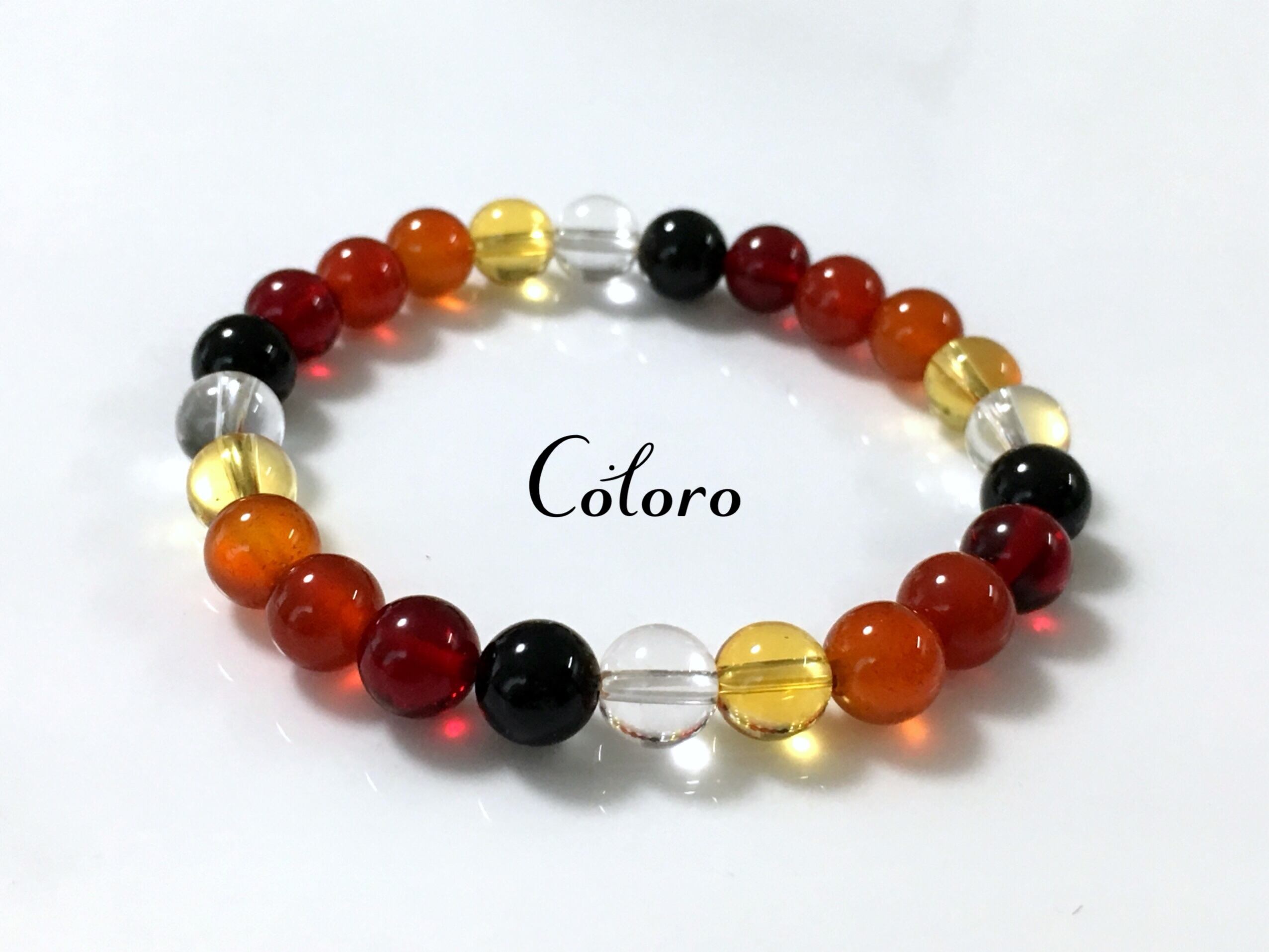 ☆シトリン(熱加工)・カーネリアン・レッドカラーアゲート・プレストレッドアンバー(琥珀)・天然クリスタル(天然水晶)・オニキス☆パワーストーン(天然石)☆ハンドメイドブレスレット☆グラデーション☆サンセット☆
