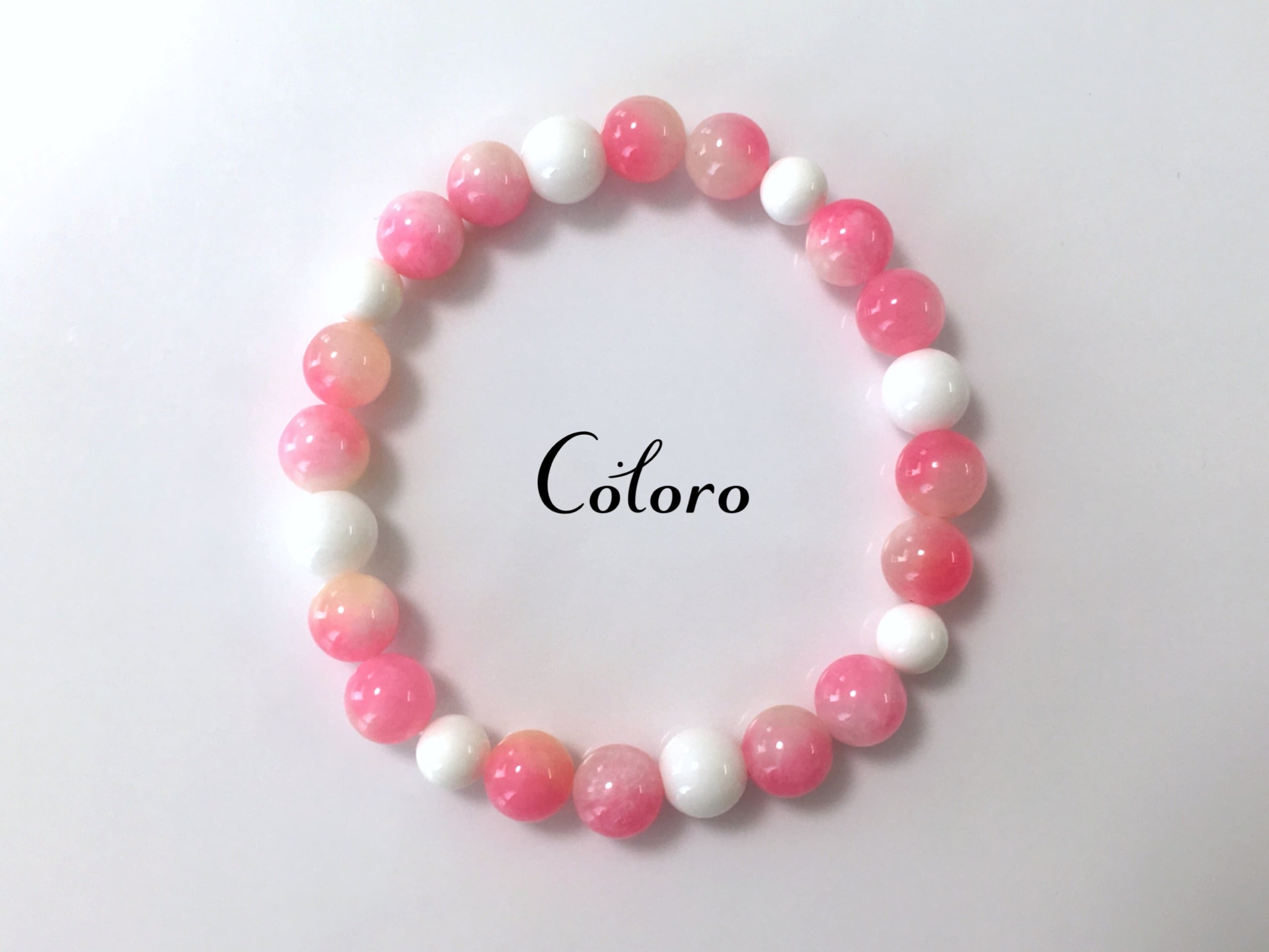 【桃色・白桃】☆白翡翠(染色)・ホワイトオニキス☆パワーストーン(天然石)☆ハンドメイドブレスレット☆イチゴミルク☆苺☆いちご☆チューリップ☆コスモス☆桜☆秋桜☆ピーチ☆果物☆果実☆パステルカラー☆