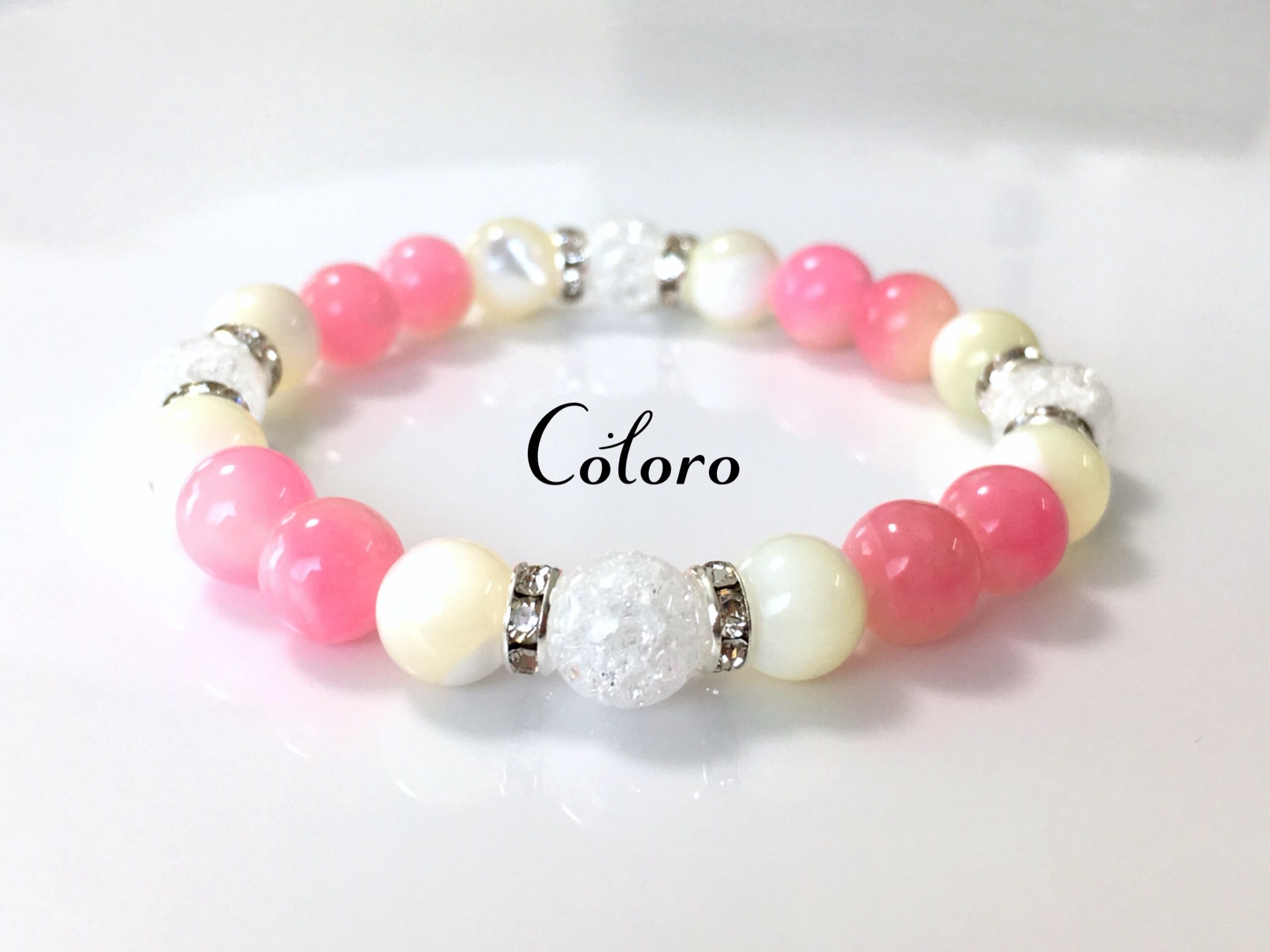 【桃色・白桃】☆白翡翠(染色)・マザーオブパール・クラッククリスタル☆パワーストーン(天然石)☆ハンドメイドブレスレット☆苺☆いちご☆チューリップ☆コスモス☆桜☆秋桜☆ピーチ☆パステルカラー☆