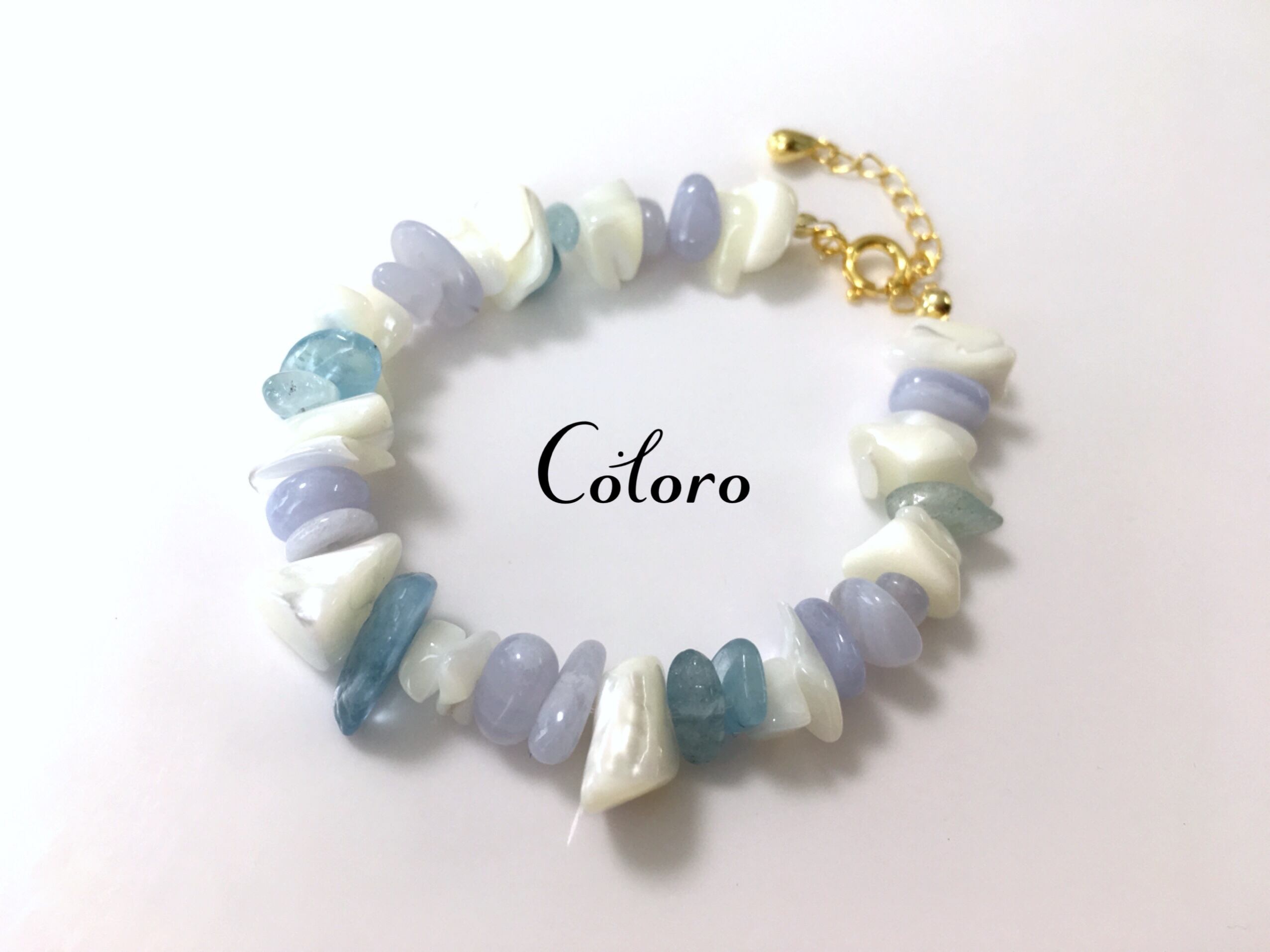 ☆アクアマリン・ブルーレースアゲート・マザーオブパール☆ミニタンブル・さざれ石☆パワーストーン(天然石)☆18KGPアジャスター付☆ハンドメイドブレスレット☆