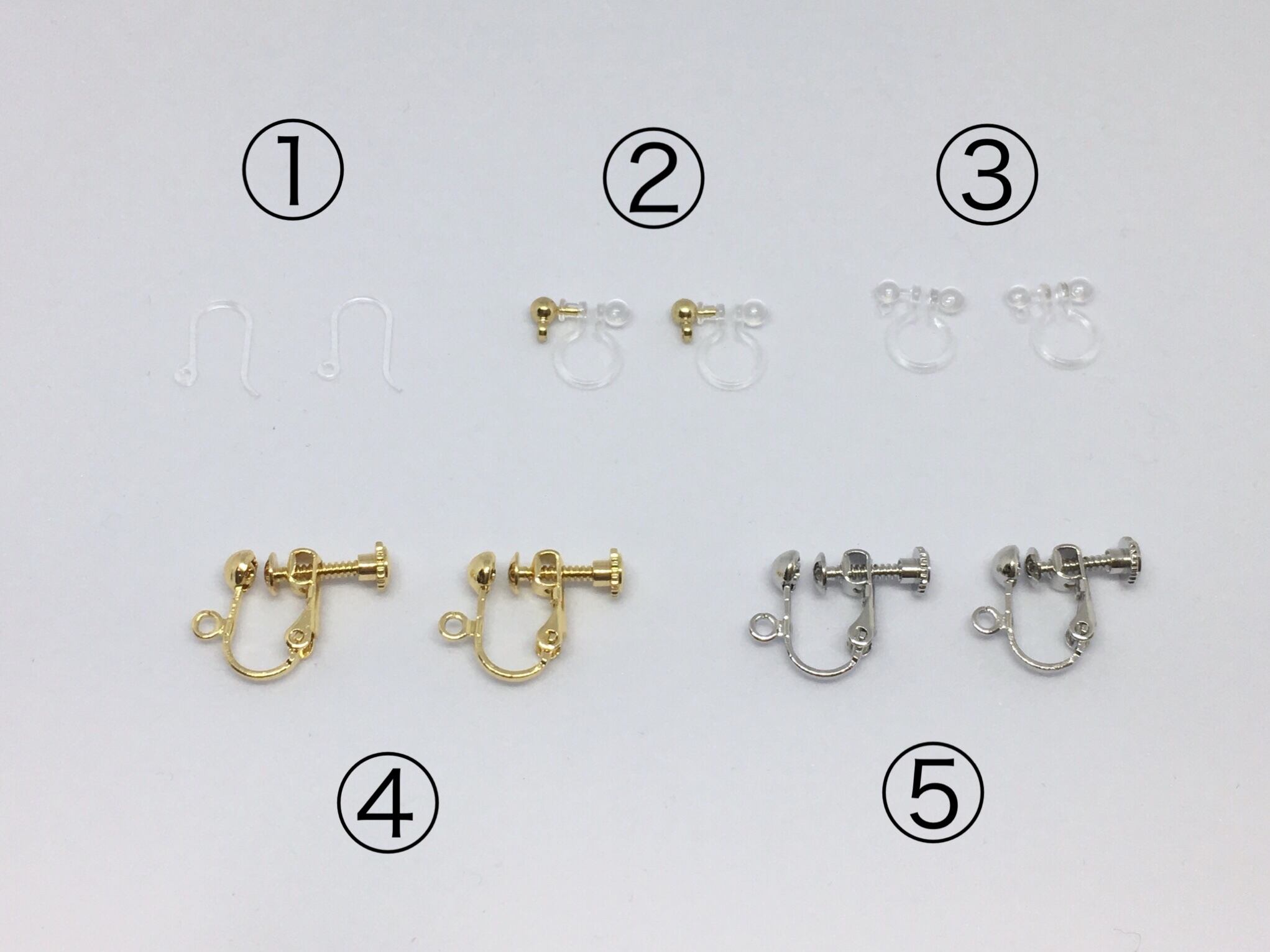 ※御希望の方には①樹脂製クリアピアスフープ、②樹脂製クリアノンホールピアス ゴールドカラー丸玉カン付、③樹脂製クリアノンホールピアス 丸玉カン付、④真鍮製イヤリングゴールドカラー、⑤真鍮製イヤリングロジウムカラーの中から、無料にて変更致します。