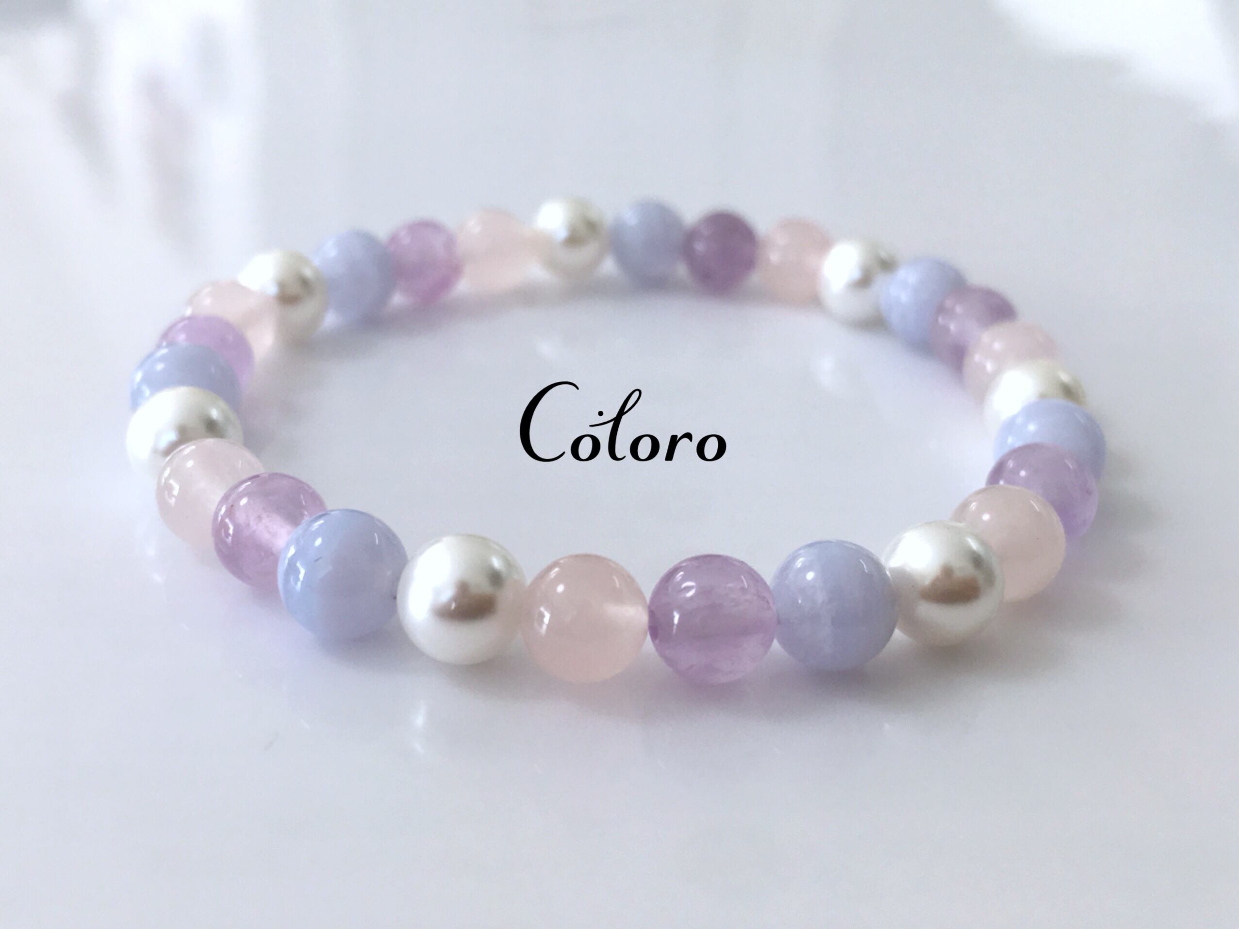 ☆6mmローズクォーツ・ラベンダーアメジスト・ブルーレースアゲート・シェルパール(マザーオブパール)☆パワーストーン(天然石)☆ハンドメイド☆ブレスレット☆