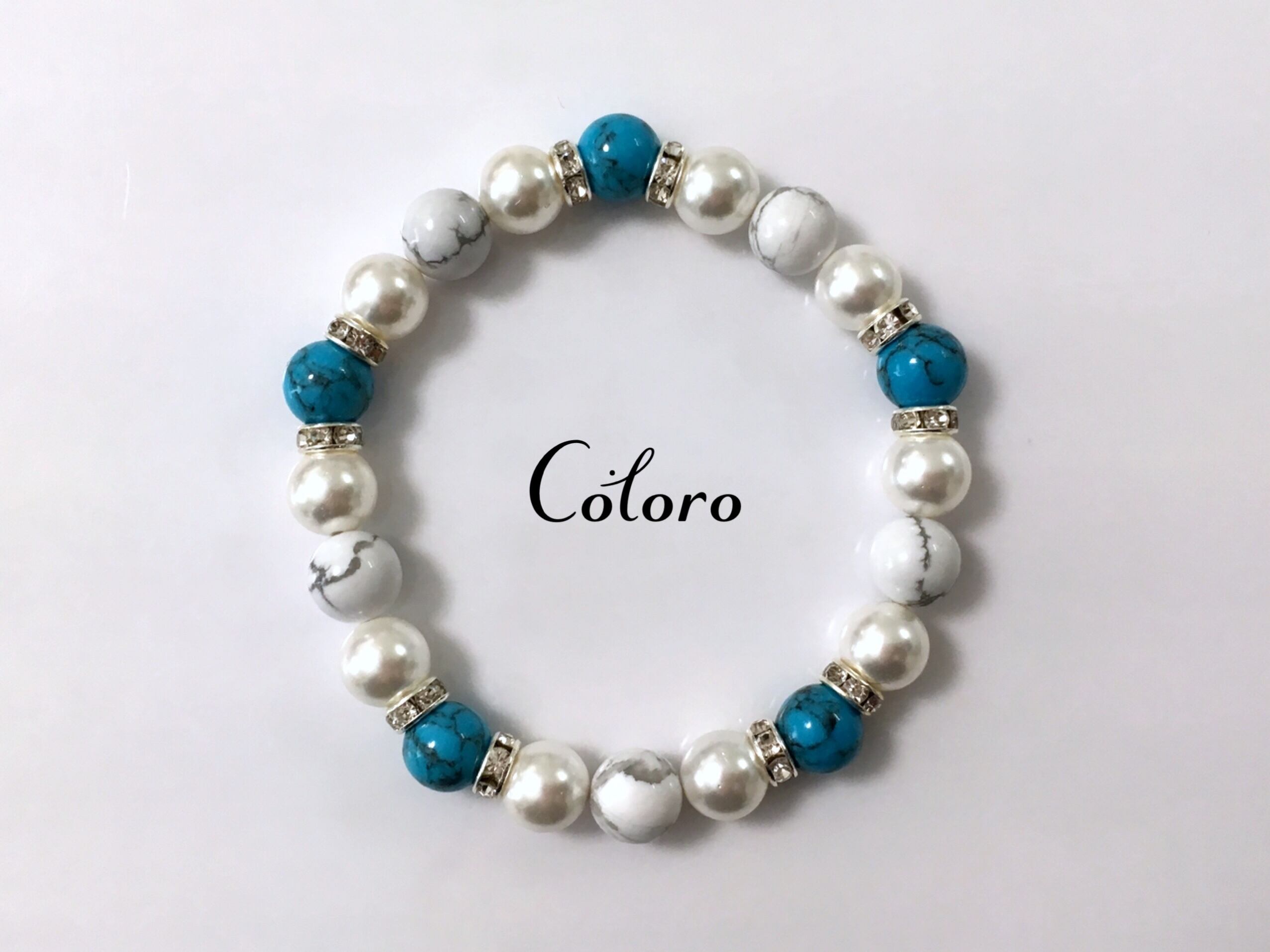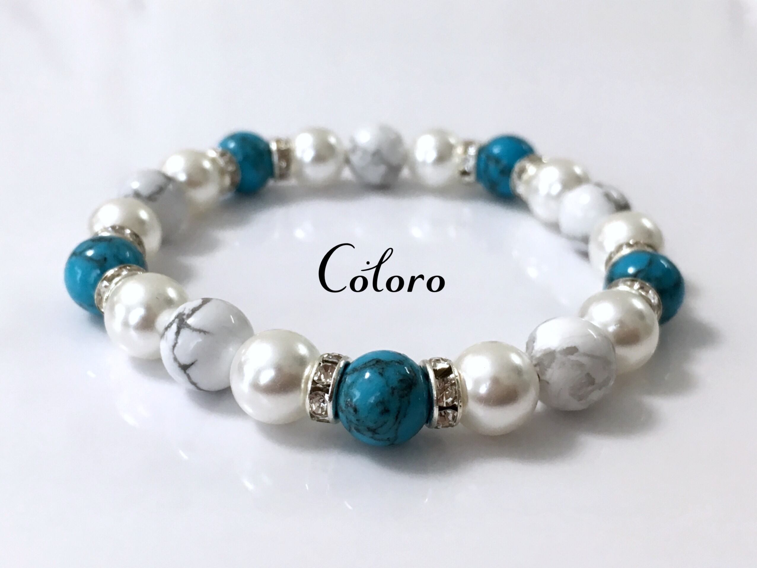 ☆マグネサイトターコイズ・マグネサイトハウライト・シェルパール(マザーオブパール)☆パワーストーン(天然石)☆ハンドメイド☆ブレスレット☆