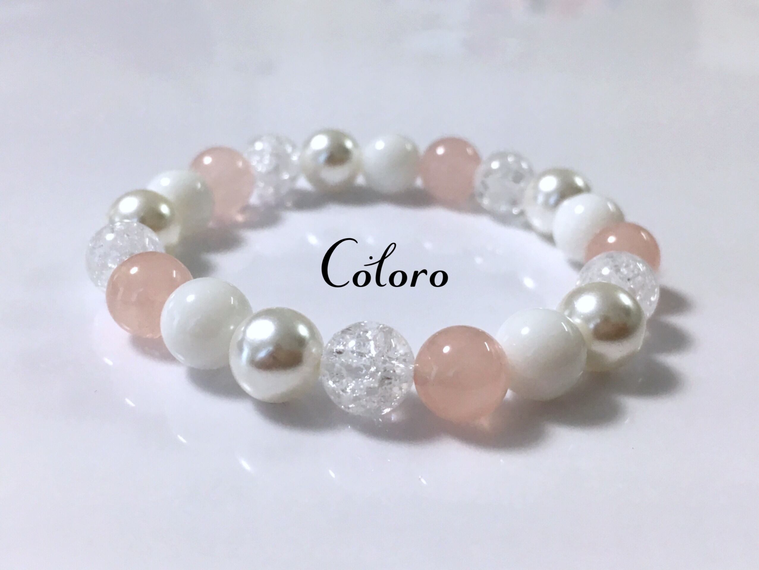 ☆ローズクォーツ・ホワイトオニキス・シェルパール(マザーオブパール)・クラッククリスタル☆パワーストーン(天然石)☆ハンドメイド☆ブレスレット☆