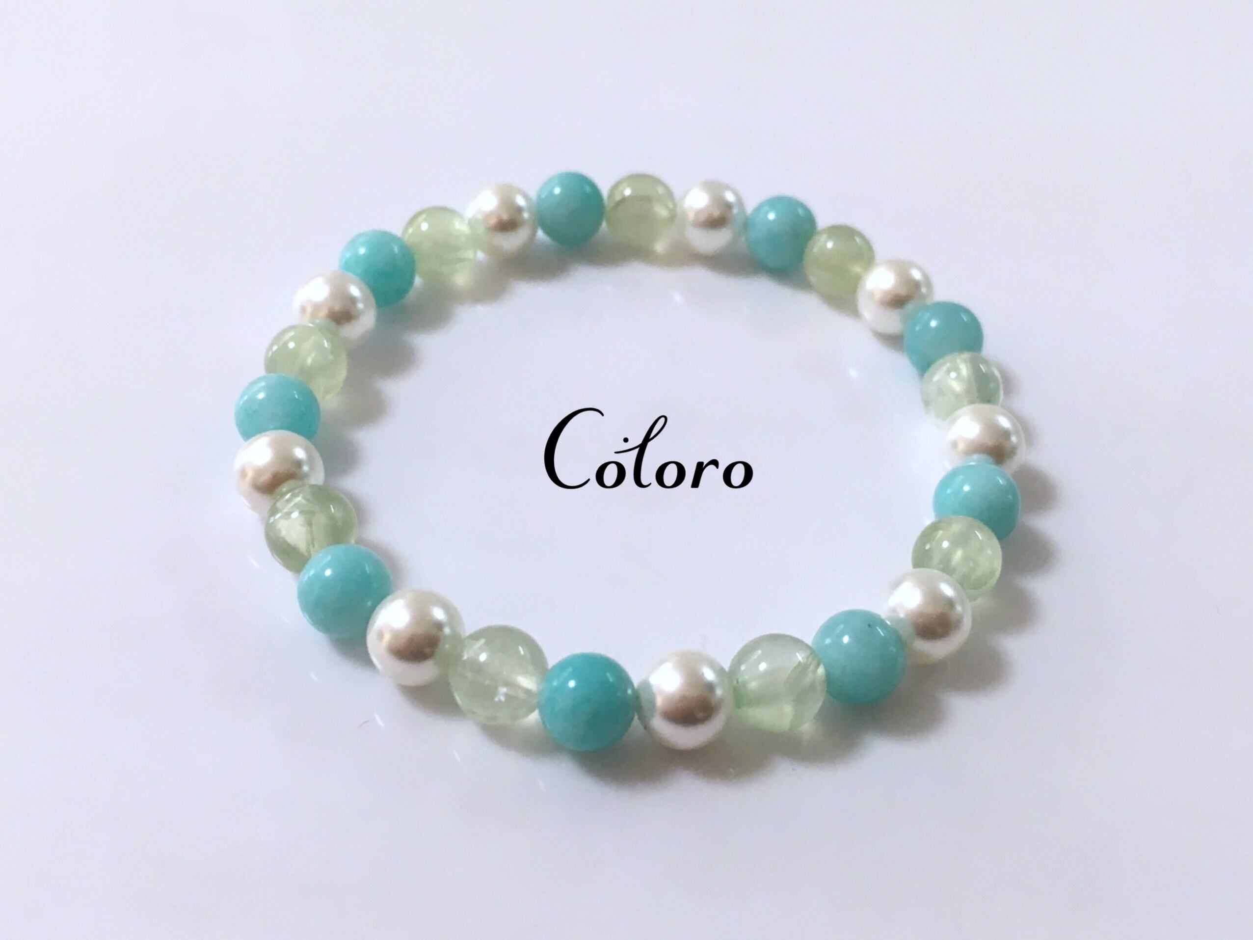 ☆6mmプレナイト・アマゾナイト・シェルパール(マザーオブパール)☆パワーストーン(天然石)☆ハンドメイド☆ブレスレット☆