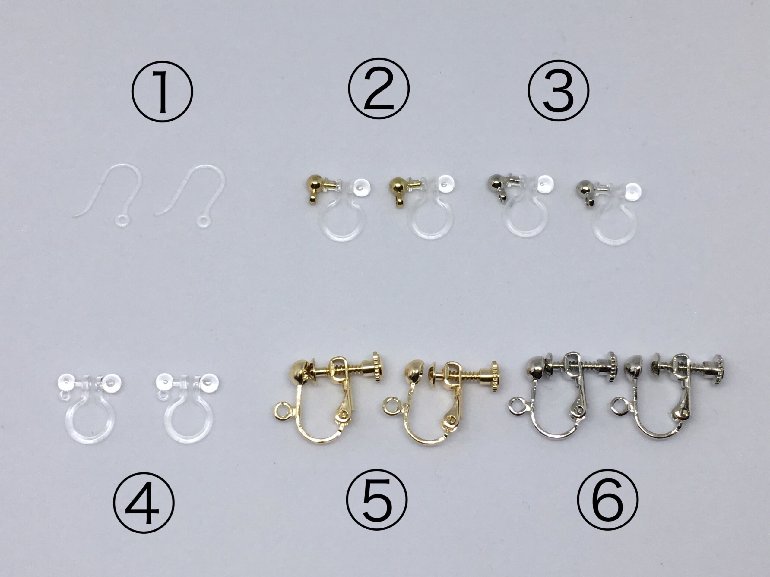 ※御希望の方には①樹脂製クリアピアスフープ、②樹脂製クリアノンホールピアス ゴールドカラー丸玉カン付、③樹脂製クリアノンホールピアス シルバーカラー丸玉カン付、④樹脂製クリアノンホールピアス 丸玉カン付、⑤真鍮製イヤリングゴールドカラー、⑥真鍮製イヤリングロジウムカラーの中から、無料にて変更致します。
