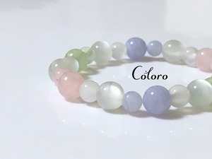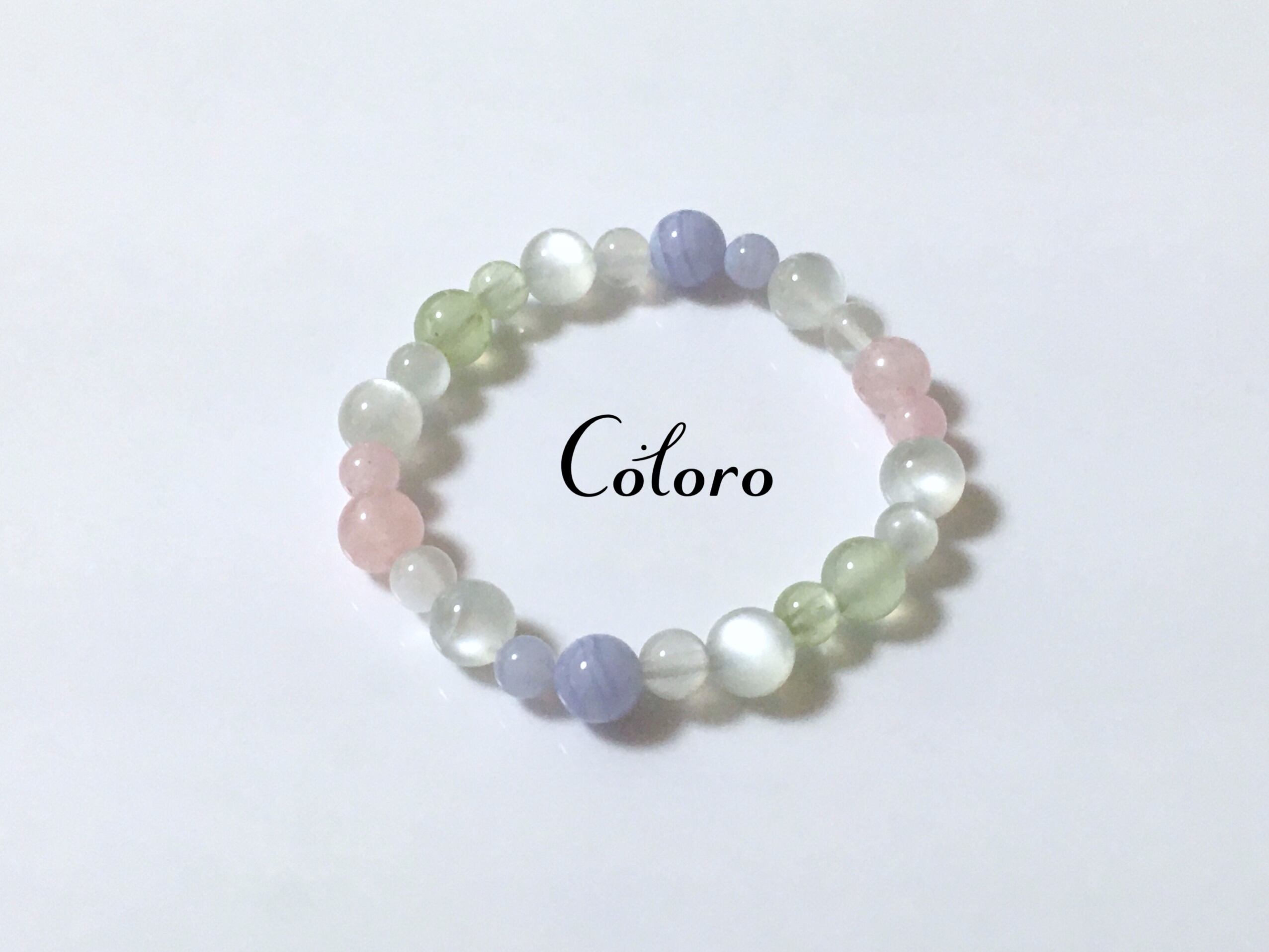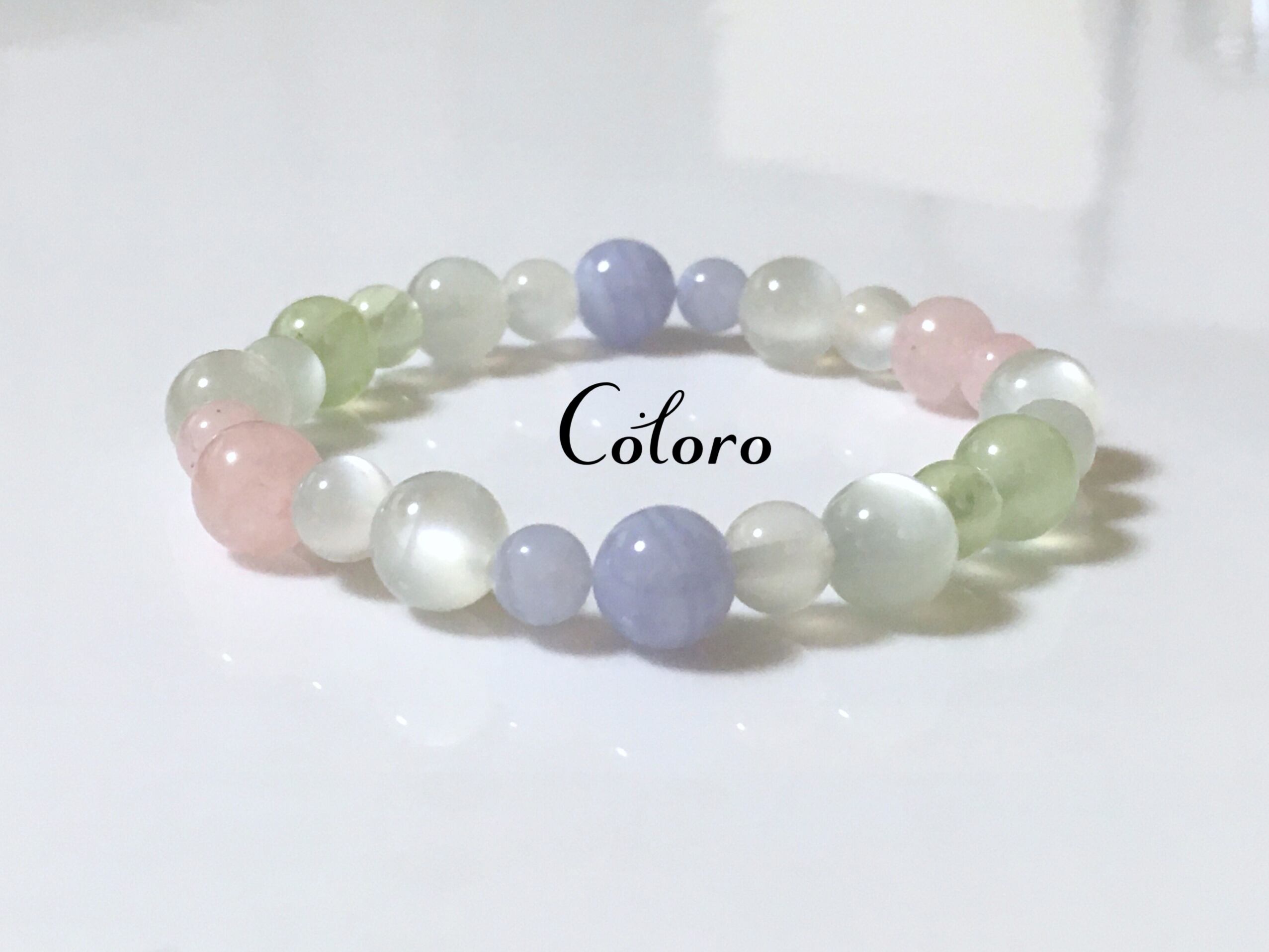 【送料無料】☆ホワイトムーンストーン・ブルーレースアゲート・ローズクォーツ・プレナイト☆誕生石☆天然石☆ハンドメイド☆ブレスレット☆パステルカラー☆ペールカラー☆ペールトーン☆春☆桜☆